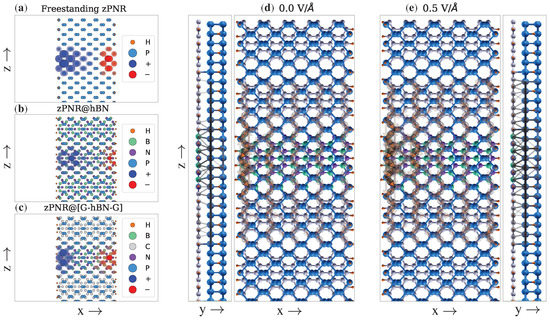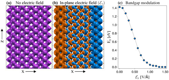 As opposed to zGNRs, which have the charge localized mostly along the two edges, for zPNRs, the charge is more evenly distributed, as depicted in Figure 3a. This behavior is further translated in the current flow pattern, which is more localized along the central axis of the zPNR, in contrast to the established edge transport in zGNRs, as pointed out in a subsequent discussion. However, applying an in-plane electric field along the x-direction, of magnitude , a charge imbalance occurs between the two edges, described by , where and are the valence charge densities with and without the applied electric field. Figure 3b shows the spatial distribution of , which exhibits large magnitudes at the two edges and decreases toward the zPNR median with alternating signs. This has implications in the charge transport, as the current in ideal zPNRs will flow predominantly within the vicinity of one of the two edges. The in-plane electric field reduces the band gap, which eventually closes at a quite large value, reaching a metallic-like behavior, as can be seen from Figure 3c. As shown in Refs. [23,24], the gap closure is influenced by the lateral width of the PNR as well as the type of passivation. However, the relatively large value necessary for the electric field is problematic in practical applications and requires further attention.
