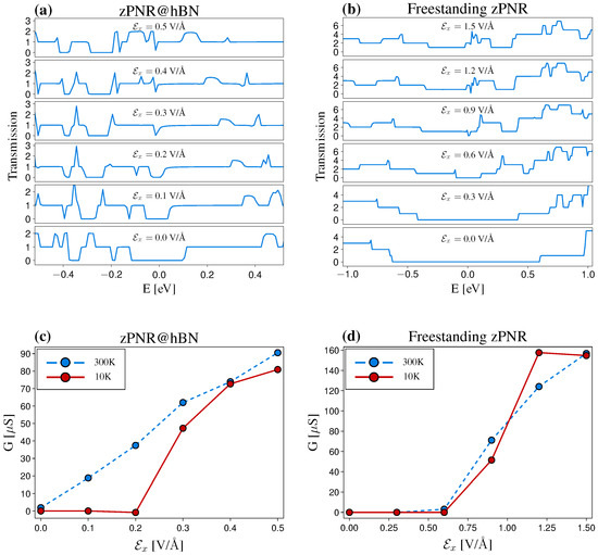 In the following, we investigate the influence of the support layers on the electronic and transport properties of zPNRs, in the context of double-layer heterostructures. First, we consider the zPNR@hBN system and analyze the ideal transmission for a sequence of values and compare it with the freestanding PNR. Figure 4 shows the systematic reduction in the band gap for both systems, as the in-plane electric field is increased. In the zPNR@hBN configuration, the band gap is closed at a significantly smaller , in the range of 0.2–0.3 V/Å, as compared to the freestanding nanoribbon, where the gap closure occurs at eV/Å. Consequently, the conductance, , evaluated in the limit of low temperatures (10 K) and at room temperature (300 K), is sharply increasing for the heterostructure at electric fields below 0.3 V/Å, whereas for the freestanding PNR, it is limited by the poor reduction in a large gap. From the experimental point of view, the gap reduction is significant, bringing the maximum values of the electric fields in a feasible range [36,37].