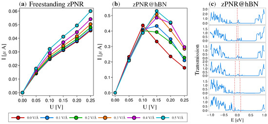 The analysis of the non-linear bias regime reveals further differences between the two systems, as described in Figure 5. First, the implementation of proper metallic contacts should be addressed, and one possible option is to control the edge passivation. In particular, no passivation results in the metallic behavior of zPNRs, as discussed before. Therefore, using passivated and unpassivated zPNR segments, one can assemble the device structure with contacts and an active region. On one hand, the pristine freestanding zPNR exhibits a steady increase in the current with the applied bias. In correspondence with Figure 3b, the I–V characteristics present little modulation even at high electric fields. On the other hand, this is in contrast to the zPNR@hBN system, which presents larger current magnitudes, higher modulation and, in addition, a negative differential resistance (NDR) behavior for biases U > 0.10 V. This can be explained based on the transmission function in the bias window . At large biases, the widths of the resonant energy levels in the bias window tend to decrease, reducing the current. This can be likely assigned to enhanced reflections due to the larger potential variation under bias. On the other hand, for the freestanding zPNR, in the same range of biases (0–0.25 V), the rather insulating properties lead to a significantly smaller current, without NDR effects being present.