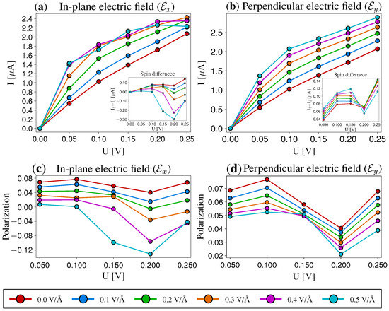 I–V characteristics (a,b) and spin polarization (c,d) for systems with in-plane() and perpendicular() electric fields. The modulation of the charge currents becomes similar for both electric-field orientations. The insets show the net spin currents. In addition, a spin polarization switching is found around an in-plane electric-field value 0.2 V/Å at a bias V.