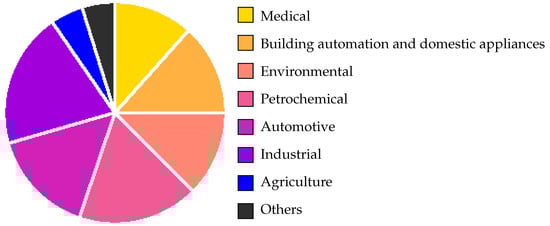 Industries of relevance for the gas sensor market and their global financial shares by end-use in 2021. (source: https://www.grandviewresearch.com, accessed on 26 September 2022).