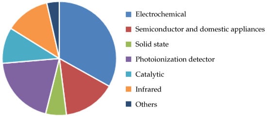 United States gas sensors market share by technology in 2019. (source: https://www.gminsights.com, accessed on 26 September 2022).