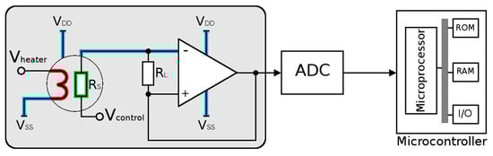 A typical resistive SMO sensor circuit is shown in Figure 3. The microheater (red), sensing element (green), critical interconnects (blue), and analog and digital circuitry are all on a single system-on-chip (SoC) implementation [,]. The complexity of such an integration is immediately evident. The critical component is the integration of the microheater, since this needs to provide a high temperature to the sensing film while not disturbing the temperature of the nearby digital, analog, or RF components. An additional challenge is to reduce the sensor size while making sure that the microheater provides a stable and uniform temperature over the entire sensor area without the threat of total mechanical failure [].