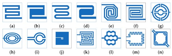 Microheater geometries characterized and modeled over the last decades. The shapes depicted are: (a) Meander, (b) S-meander, (c) Curved, (d) S-curved, (e) Double spiral, (f) Square double spiral, (g) Drive wheel, (h) Elliptical, (i) Circular, (j) Plane plate, (k) Fin shape, (l) Honeycomb, (m) Loop shape, (n) Irregular.
