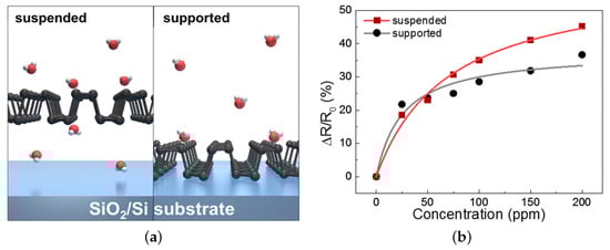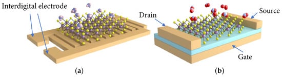 Schematic representation of gas sensors using (a) a chemiresistive configuration and (b) a back-gated FET configuration. (Reprinted with permission from Cao et al. [], CC-BY 4.0).