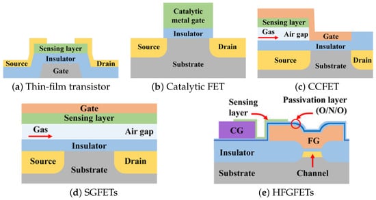 A proper review of FET-based technologies for gas sensors is presented by Hong et al. in []. Here, we will provide only a general description of available technologies in order to understand how they relate to potential CMOS integration and, in particular, integration with digital logic transistors. The key to FET-based gas sensors is ensuring that the ambient gas, which should be detected, is able to control the conductivity in the channel by modifying the electric field through the gate oxide, effectively by manipulating the field effect. Access to the channel can be obtained through several configurations, including thin-film transistors, catalytic metal gate field-effect transistors (MGFETs), suspended gate field-effect transistors (SGFETs), capacitively-coupled field-effect transistors (CCFETs), or horizontal floating-gate field-effect transistors (HFGFETs), all of which are shown in Figure 11.