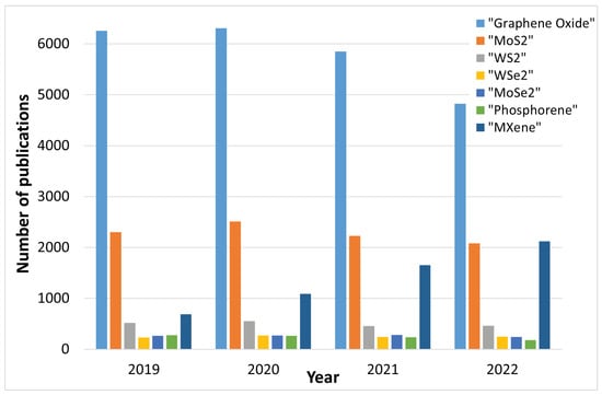 Beyond transistor scaling and digital logic, interest in 2D materials has intensified over the past years due to their potential usability in a wide range of applications. Due to the low dimensionality of these materials, they exhibit properties of relevance to several research fields from solid-state physics to low dimensional molecular chemistry. Therefore, even minor shifts in the chemical structure of the film’s surface can be felt in its bulk properties. This feature makes 2D materials ideal for catalysis [,,,] and sensing [,,]. The range of application for gas sensing is immense and includes devices which are able to detect hazardous gases, organic vapors, and humidity: Devices frequently used for medical diagnostics, environmental monitoring, and safety and security []. TMDs including MoS2, MoTe2, WSe2, and SnS2 have already been widely studied for gas sensing in the FET configuration, primarily for the detection of nitrogen-containing compounds. In the chemiresistor configuration, a broader group of 2D materials have shown high potential for gas sensor development, including TMDs, boron nitride, black phosphorus, and MXenes [,]. The recent review of these materials by Wang et al. [] goes into some detail discussing the potential of these films for gas sensing. However, they do not discuss the means or potential for their integration with CMOS fabrication or electronics, which is the main basis for this review. What makes 2D materials even more interesting for sensing is their potential to detect a broad range of disease biomarkers, both as a gas sensor of VOCs from exhaled breath, and from bodily excretions, such as urine, blood, tears, or saliva in the form of 2D-based bioFETs [,]. In general, there is great hope that 2D materials can revolutionize medical diagnostics and healthcare [,,,].