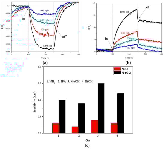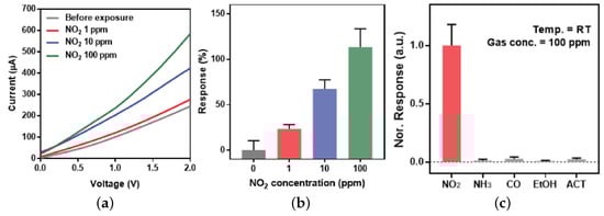 For chemiresistors, the electrical resistance of the sensor changes as a consequence of the adsorption of gas molecules on its surface. The sensitivity S towards a particular gas is, therefore, determined by how much the resistance of the film changes after exposure to this gas, usually starting from a baseline using operating conditions in pure ambient air. However, it should be noted that some studies use inert ambient, e.g., N2, as the baseline resistance, which is why it is often difficult to truly compare sensitivities across a broad set of experimental literature studies. From all of the available types of semiconductor-based gas sensors, the chemiresistor is the easiest to fabricate, since it only requires placing the sensing film on top of an insulating substrate and two metal contacts, which are often formed using interdigitated electrodes, cf. Figure 10a. The read-out circuit for the chemiresistive gas sensor is also quite straight-forward since only the current flowing through the resistor needs to be measured, which can be performed by placing a load resistor and reading the voltage across it [,]. The ease of chemiresistive gas sensor fabrication brings about the potential for their cost-efficient fabrication, ability of scaling, and eventual CMOS integration.