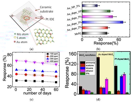 - Burman, D.; Raha, H.; Manna, B.; Pramanik, P.; Guha, P.K. Substitutional doping of MoS2 for superior gas-sensing applications: A proof of concept. ACS Sens. 2021, 6, 3398–3408. [Google Scholar] [CrossRef]