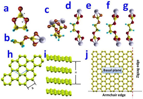 We studied the adsorption of the CH2CH2OCO2Li molecule on the two kinds of edge surfaces of graphite, (a) zigzag edge surface and (b) armchair edge surface, as shown in Figure 2d–g. Their corresponding side-views are also shown on the side for a clear view. We found very strong adsorptions of CH2CH2OCO2Li on the zigzag edge surface of graphite, of −0.91 eV. The adsorption on the armchair edge surface was −0.54 eV. In this orientation, the C1-O2-O3 planes were parallel to the graphite layers, which left the channel for the migration of Li atoms and intercalation, while blocking other solvent molecules.