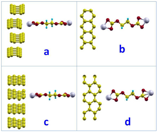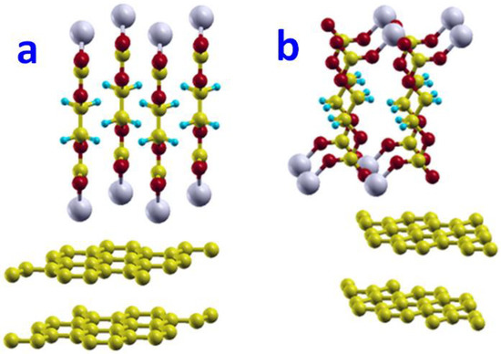 Similarly, the networking of (CH2OCO2Li)2 was studied on the armchair edge surface. After full relaxation, the (CH2OCO2Li)2 molecules formed a network on the armchair edge surface of graphite, as shown in Figure 6c,d.