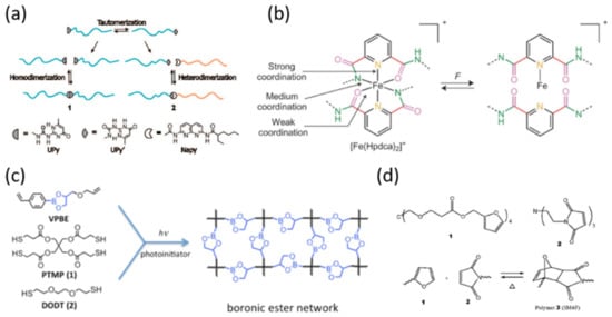 Supramolecular chemistry is favored in SH materials and complex battery systems due to the ease of dissociation–association and high energy efficiency. Among them, hydrogen bonds are widely used owing to their directionality and affinity. Hydrogen bonding refers to the dipole–dipole attraction between a hydrogen atom and an electro-negative atom with a lone pair of electrons (i.e., N, O, or F). In particular, hydrogen bonds based on urea-pyrimidine (UPy) groups are most widely utilized in SH materials because of their ease of application, good reversibility and strong temperature-mechanical property correlation (Figure 2a) [26].