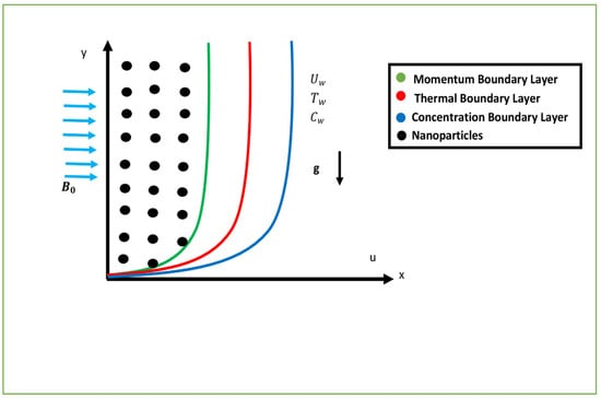 Schematic geometry of the flow problem. stands for the velocity at the wall, denotes the wall’s temperature, denotes the concentration at the wall, denotes the gravitational acceleration, and denotes the applied magnetic field.