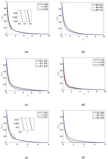 Figure 2 displays the influence of , , , and on the velocity distribution. Figure 2b depicts that the velocity boundary layer reduces by enhancing the magnetic parameter (). Since the magnetic field acts as a hurdle to transport the fluid flow, it causes lessening in the velocity profile. Additionally, the rise in enhances the Lorentz force, which generates resistance to the transport phenomenon; hence, it also decreases the fluid’s velocity. The impact of on the velocity profile is shown in Figure 2a. Its effect on the velocity profile is the same as earlier discussed in Figure 2b. The graphs in Figure 2c displays that the decreases as the suction/injection parameter increases. Figure 2d demonstrates the influence of the permeability parameter on the velocity profile. In Figure 2d, it can be noticed that the decreases as the value of the permeability parameter increases. Figure 2e depicts the effect on the for the various values of the viscosity parameter . The plots in Figure 2f show that the increases with the growing values of since the buoyancy effect enhances fluid flow speed.