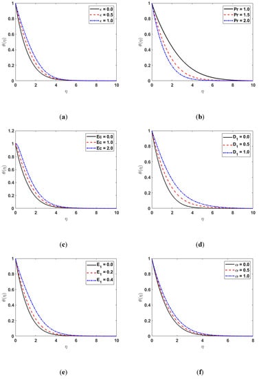 The effect of the variable thermal conductivity on the temperature distribution is indicated in Figure 3a. The temperature of the fluid increases by increasing the thermal conductivity ϵ since the transmission of heat from the sheet to the fluid is higher for the higher values of ϵ. Figure 3b characterizes the impact of the Prandtl number on . Figure 3b shows that when the Prandtl number increases, the temperature profile decreases. Since the Prandtl number is the ratio of momentum to thermal diffusivity, the temperature profile decreases by increasing . The effect of the Eckert number on is presented in Figure 3c. The graph in Figure 3c shows that raising the will increase in . The influence of irregular heat parameters and on is depicted in Figure 3d,e. The is enhanced as the values of and are increased. Figure 3f illustrates the impacts of the viscosity parameter on . Figure 3f shows that for large values of , the thermal boundary-layer thickness also increases.