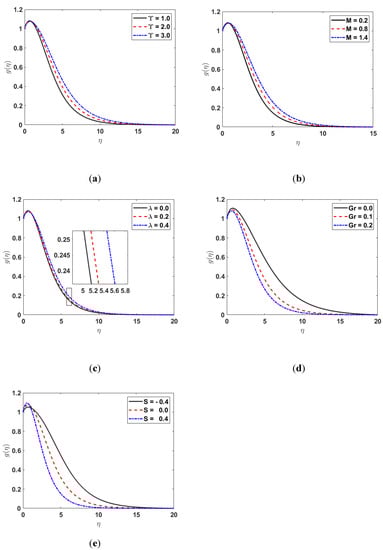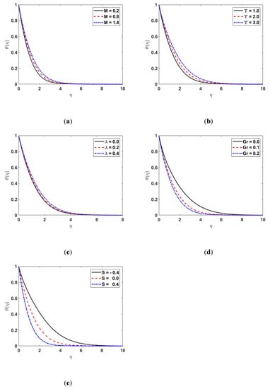 Figure 4 shows the impact of , , , and on . Figure 4a illustrates the behavior of on . The fluid’s temperature and the thermal boundary-layer thickness both rise as the magnetic effect rises. Physically, it occurs because the stronger the Lorentz force is, the greater the heat production is from the fluid’s surface, which increases the fluid’s temperature profile. Figure 4b depicts the effect of on . Due to an increase in , heat transfer from one particle to another slows down, which is responsible for the decrease in . Figure 4c depicts the influence of on . This has a similar impact to that mentioned earlier in Figure 4a. Figure 4d depicts the influence of on . As the Grashoof number enhances, also increases because the buoyancy effect enhances the speed of the fluid, which, as a result, decreases . The impact of on is demonstrated in Figure 4e. It is noted that the temperature profile increases as increases.