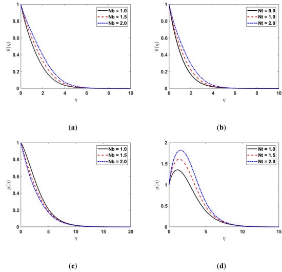 Figure 5a shows the impact of on . Since the temperature profile and Brownian motion parameter are directly linked, the thermal boundary-layer thickness grows with the rising values of . Figure 5b illustrates the effect of on . As rises, the temperature profile also rises, thus, the thermal boundary-layer thickness increases. Figure 5c displays the effect of on the concentration profile . By increasing the Nb, the nanofluid concentration is decreased. The effects of on the are depicted in Figure 5d. The graph in Figure 5d shows that when increases, the concentration profile also increases.