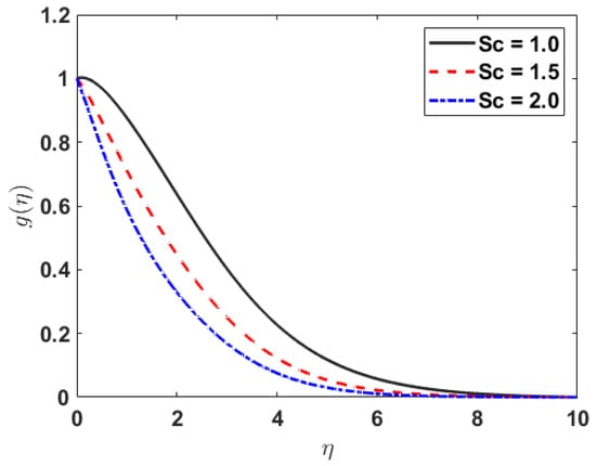 Figure 7 depicts that the concentration profile e reduces for the growing values of .
