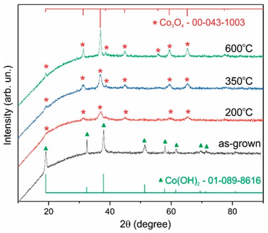 Figure 1 shows the XRD pattern of the as-synthesized sample as well as powder annealed at 200, 350, and 600 °C. The observed structures of the diffraction peaks are completely in line with the standard diffraction pattern of Co(OH)2 (JCPDS card No. 01-089-8616) in the as-grown sample and Co3O4 (JCPDS card No. 00-043-1003) in annealed samples. The presence of the CoO phase was not detected. The full width at half maximum (FWHM) of the peaks decreases with increasing annealing temperature. Estimation of crystallite sizes using Scherrer’s formula gives crystallite sizes of 6, 8, and 17 nm for annealing temperatures of 200, 350, and 600 °C, respectively. These nanocrystals aggregate into platelet-like porous particles (Figure S1a, Supplementary Materials), and the shape does not change after annealing at 200 °C (Figure 2). The particles are easily crushed into smaller particles after milling (Figure S1b).
