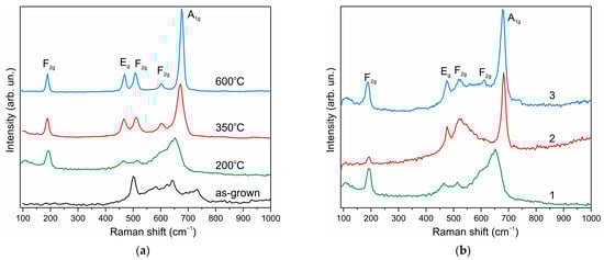 The Raman spectra of Co3O4 nanoparticles (Figure 3a) were measured under low excitation power of 0.035–0.122 mW. The Raman spectrum of the as-grown sample (Figure 3a, spectrum 1) can be attributed to Co(OH)2 nanoparticles []. The sample annealed at 200 °C (Figure 3a, spectrum 2) represents a weakly formed spectrum, which can be attributed to the Co3O4 spinel structure with broad lines due to the nanosize effect. Raman spectra completely corresponding to spinel Co3O4 [,] are observed after annealing at 350 and 600 °C.