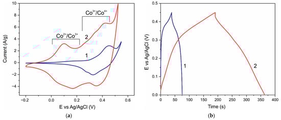 Cyclic voltammetry (CV) and galvanostatic charge/discharge (GCD) characteristics of a Co3O4 electrode before and after annealing in hydrogen at 275 °C for 1 h are shown in Figure 4. The CV curves of the pristine electrode show the presence of one major pair of Co3+/Co4+ redox peaks (Figure 4a, curve 1). As a consequence, the GCD curves are significantly non-linear (Figure 4b, curve 1). H2-treatment of the same electrode causes the CV curves to show significant current over a wide range of potentials (Figure 4a, curve 2); i.e., a wide range of active redox sites are created during H2-treatment.