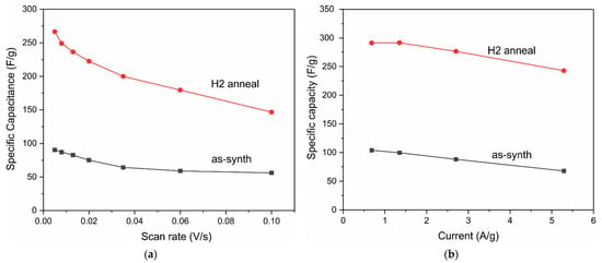 where I is the discharge current (A), dt is the discharge time (s), C is the capacity (F), and ΔU is the voltage drop. The capacitances of the electrodes (Figure 4b) were 85.8 F g−1 and 403.8 F g−1 at a current density of 1 A g−1 for the pristine electrode and after H2-treatment, respectively, which is close to the CV results. As a result of H2-treatment, the capacitance increased by a factor of ≈4.7. The GCD curves (Figure 4b) before H2-treatment deviate strongly from straight lines, i.e., the Co3O4 NPs electrode is the battery type. H2-treatment leads to an increase in the range of potentials at which a significant current is observed, i.e., the spectrum of active centers involved in redox reactions expands due to Co2+/Co3+ transitions and surface states. Accordingly, the GCD curves after H2-treatment are close to straight lines; the recovered Co3O4 NPs electrode shows pseudocapacitive behavior. Figure S3 shows the GCD dependences at different discharge currents before and after H2-treatment for the Co3O4 NPs electrode with a loading of 5.2 mg, and the specific capacitance vs. scan rate and discharge current are shown in Figure 5.