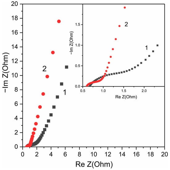 Figure 6 shows Nyquist plots of Co3O4 electrode (load 3 mg) before (1) and after (2) H2-treatment in the frequency range of 0.01–5 × 104 Hz. It can be seen that the Nyquist plots consist of a high-frequency semicircle, the diameter of which depended on the potential, so this plot can correspond to the charge transfer resistance (Rct) or internal resistance []. The diameter of the semicircle at low frequencies (see the inset to Figure 5) significantly decreased after H2-treatment, which indicates an increase in the pseudocapacitive properties.