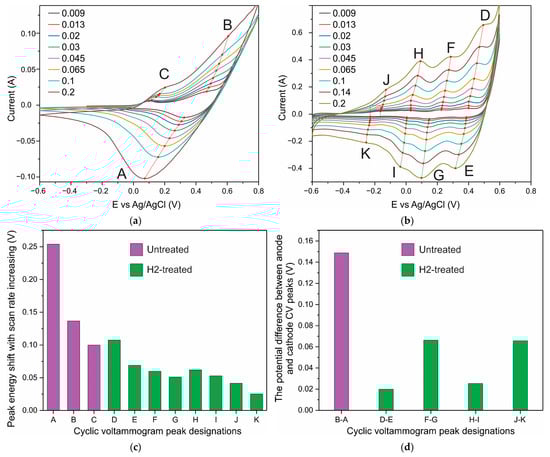 In addition, a small potential difference or its absence between the anode and cathode current peaks at low CV sweep rates is evidence of the reversibility of the redox reaction and the capacitive nature of the system []. The position of the maxima of the anodic and cathodic peaks in the CV curves changes slightly with a change in the scan rate if the capacitance is controlled by surface processes. These effects are observed in H2-treated samples. The main pair of anode–cathode peaks corresponding to the Co3+/Co4+ transition is present in the initial samples (Figure 7a). H2-treated samples show several anode–cathode pairs over a wide range of potentials (Figure 7b). Figure 7c shows that as the scan rate is increased from 0.009 to 0.2 V s−1, the peak position shifts for the untreated sample (A–C) are significantly greater than those for the H2-treated sample (peaks D–K). In addition, the potential difference between the anodic and cathodic peaks in redox pairs in the untreated sample is large (≈150 mV), and it decreases two or more times as a result of H2-treatment (Figure 7d). Thus, near-surface centers increase the contribution to the current response as a result of H2-treatment.