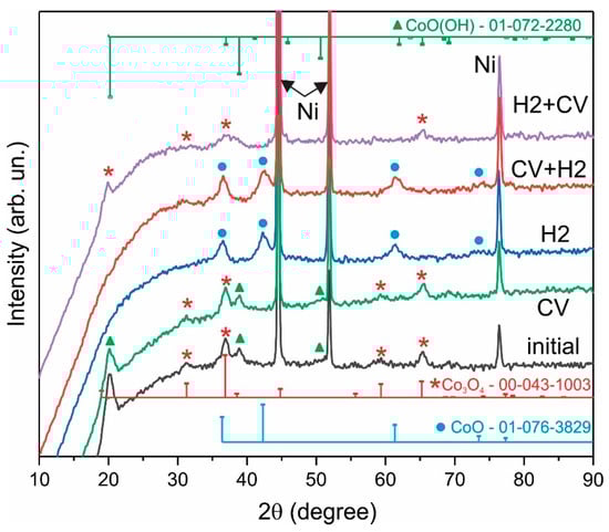 H2-treatment also leads to a significant change in XRD patterns (Figure 8). The initial sample is dominated by the cubic phase of spinel Co3O4 (PDF Card No.: 00-043-1003), and in situ oxidation does not change the phase composition. After H2-treatment, a cubic rock salt structure CoO is formed (PDF Card No.: 01-076-3829). The surface of nanocrystals of this phase is prone to oxidation; therefore, after CV measurements, the in situ oxidation of the CoO phase to the Co3O4 phase occurs. The XRD pattern H2+CV (Figure 9) again demonstrates the presence of a spinel structure of Co3O4 nanocrystals, while the intensity of the Co3O4 reflections decreases and the half-width increases compared to the initial XRD pattern.