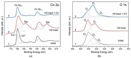 H2-treatment results in broadening the Co 2p3/2 and Co 2p1/2 peaks of the Co 2p spectra and increasing to energies of 780.7 eV and 796.7 eV, correspondingly; also, intense satellites at energies of 786.5 eV and 803.0 eV appear, which indicates the presence of Co2+. The Co 2p XPS spectrum (curve 2) completely coincides with the standard spectrum of CoO []. The XPS spectrum of electrodes subjected to in situ oxidation decreases in intensity but completely repeats the shape of the XPS spectrum of pristine Co3O4 electrode.