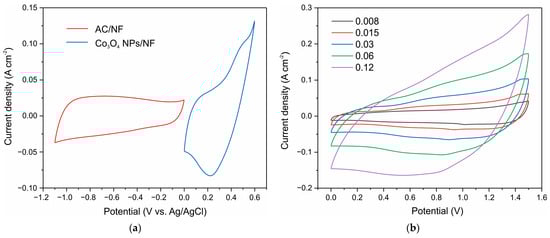 To evaluate the supercapacitor application of the materials, the electrochemical properties of Co3O4 nanoparticles were evaluated in a two-electrode system. A positive electrode was fabricated with a high loading of 41 mg Co3O4 nanoparticles on 1 cm2 nickel foam; this electrode exhibited a capacitance of 5.18 F as estimated from the CV curves at 8 mV s−1 in the 0–0.6 V range (Figure 10a). An AC–NF electrode on nickel foam with an area of 1 cm2 was prepared as a negative electrode; its capacitance from CV curves at a rate of 8 mV s−1 was 2.65 F (Figure 10a). Using a paper filter as a separator and a 3.5 M KOH electrolyte, a capacitor was assembled, whose CV curves at different scan rates of 8–60 mV s−1 are shown in (Figure 10b). The figure shows that pronounced redox pairs characteristic of battery-type materials are absent.