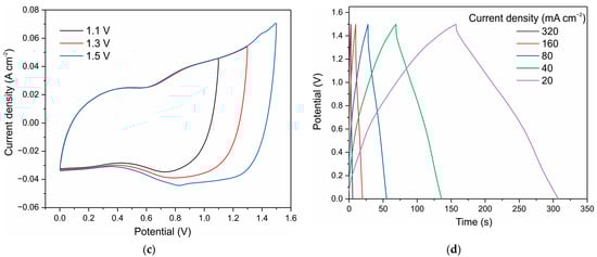 The capacitance of the resulting capacitor estimated from the CV curves at 8 mV s−1 was 2.08 F cm−2. The capacitor shows good electrochemical behavior and reversible reactions in a potential window of 1.5 V (Figure 10c).