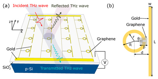 Terahertz (THz) radiation has many unique applications in sensing, imaging, spectroscopic analysis, and communications [1,2]. The development of terahertz sources and detectors, such as quantum-cascade lasers (QCLs) [3,4] and quantum-well photodetectors [5], as well as broadband time-domain spectroscopy (TDS) systems [6], has made many terahertz applications available. Nevertheless, in order to fully exploit THz applications, external modulators that can actively manipulate THz properties and simultaneously work in conjunction well with standardized sources and detectors are required. Metamaterials as a new class of artificial structure constructed by the sub-wavelength building elements have been utilized to engineer artificial media with properties unavailable in nature [7,8,9,10,11,12,13,14,15,16,17]. Furthermore, metamaterials are promising candidates to satisfy the external THz modulator’s requirements thanks to the collective resonance and strong light–matter interaction in the internal structures [7,8,9,10,11,12]. However, the response range of most predesigned metamaterials is very narrow when excited by a varying incident field, which limits many practical applications [18]. Therefore, various metamaterial structures integrated with conductivity variable materials are investigated to realize the dynamical control of the device response [19,20,21,22,23,24]. Among those conductivity changeable materials, graphene is a promising candidate for modulation as it possesses a wide conductivity change range when responding to external stimuli and is easily integrated into the metamaterial fabrication process [25,26].