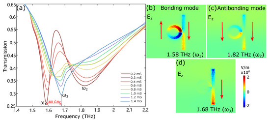 (a) Transmission spectra of the metal–graphene device for different DC graphene conductivities. With the increase in the graphene conductivity from 0.2 mS to 1.4 mS, the resonance frequency is tuned from 1.58 THz () to 1.68 THz (), with a frequency tuning range of 100 GHz. (b,c) The electric field distribution of the coupled device at two transmission dips at frequency of 1.58 THz () and 1.82 THz (). The different induced current directions in the two resonators illustrate that the low-energy mode is bonding mode while the high-energy mode is the antibonding mode of the coupled structure. (d) The electric field distribution of the coupled device is 1.68 THz when the conductivity of graphene is set at 1.4 mS. Only the bright resonator shows strong localized surface plasmon resonance, while the resonance of the dark resonator is much weaker.