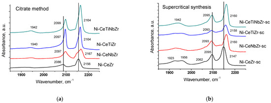 Incorporation of Ti and Nb cations into the ceria–zirconia lattice leads to a shift of the carbonyl band to higher frequency. It can be assigned to increase in the adsorption site strength, namely increasing Me4+–CO binding energy and at the same time decreasing the C-O bonding strength in the adsorbed species [8,56]. Low frequency bands at 2085–2095 and 1900–1957 cm−1 correspond to CO complexes with Ni0 sites [57,58].