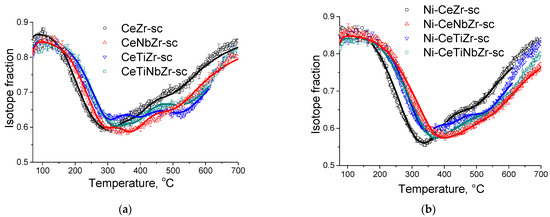 Based on these conclusions, samples prepared in supercritical synthesis are more engaging and were selected for further investigation by isotope exchange. Since oxygen mobility is provided by the support, both initial oxides and catalysts were investigated to determine the effect of supported nickel on oxygen mobility.