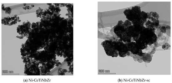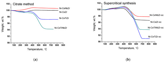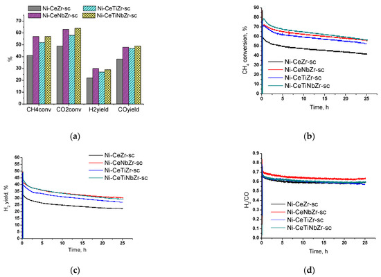 Catalysts prepared by supercritical synthesis were tested in DRM for 25 h to check their stability. The highest activity drop due to carbon formation was observed in the first three hours. In the remaining time, catalysts demonstrate quite stable operation and activity decrease of 10–13% of methane conversion for all samples. The highest activity was observed for Ni-CeNbZr-sc and Ni-CeTiNbZr-sc samples, corresponding to methane conversion of 57% and a hydrogen yield of 30% at the end of tests. For all compositions, close values of weight loss (~55%) were observed. So, in the case of long-term tests at 700 °C, the introduction of the dopant does not affect the amount of carbon deposits, but strongly affect the catalyst activity.