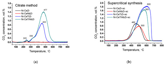 In the series of citrate samples, the highest methane conversion at 750 °C is achieved over unmodified Ni-CeZr catalyst and reached 48%. According to the values of conversion at 750 °C, activity increases in the row: Ni-CeTiNbZr < Ni-CeTiZr = Ni-CeNbZr < Ni-CeZr. It should be noted that methane conversions on the Ni-CeTiNbZr sample at the cooling step are very close to those exhibited in the heating step, suggesting a high stability of this catalyst despite its low activity.