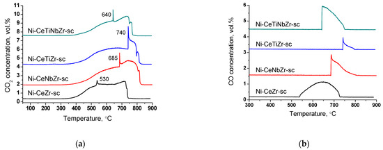At higher temperatures, a sharp increase in CO2 concentration accompanied by CO appearance (Figure 12b) in products and a sharp mass drop on the TGA curve is observed (Figure 11). Such a spike-shape of the peak is observed due to sharp increase in CO2 formation rate and insufficient recording rate of detector to obtain usual sloping peak. The combustion of carbon is a complex topochemical reaction, the rate of which passes through a maximum with its transformation. The sharp increase in carbon burning rate can be connected with several factors: release of support surface from amorphous carbon and participation of support oxygen in the gasification of carbon deposits; oxidation of metallic nickel to nickel oxide and more efficient combustion of carbon on its surface; process of carbon self-ignition, which can occur at different temperatures for various forms of carbon. The appearance of CO is associated with incomplete oxidation of carbon due to oxygen lack.