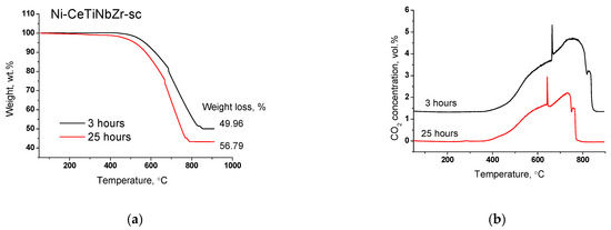 The most active catalyst Ni-CeTiNbZr-sc was additionally tested in DRM for three hours to study the amount and nature of carbon deposits. The TGA results and mass-spectroscopy data are presented in the Figure 13. The amount of carbon after three hours of testing was found to be close to that after 25 h of operation. CO2 evolution begins at the same temperature and ends at 60 degrees higher temperature that suggests a higher graphitization degree of carbon deposits. Thus, we confirmed the assumption that the main deactivation occurs in the first hours of catalyst operation.