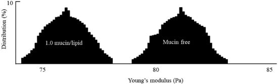 Two vesicle-moduli are summarized in Table 2 with respect to the ratio of the mucin to the DPPC. The statistical distribution was suggested in Figure 4. When compared to DPPC vesicles at 0% mucin, the moduli of the mucin-incorporated vesicles were clearly decreased. The Young’s modulus and the bending modulus of the unincorporated DPPC vesicle were 81 × 106 Pa and 11.3 × 10−19 J, and consistent with the previous research [25,34]. Therefore, both mechanical moduli appear to depend on the mucin. The incorporation of the mucin appears to disturb the headgroup packing geometry, because the vesicles would be fused to form a planar lipid-layer through adsorption if the tail-groups were affected into unsaturated property [35]. Therefore, even though the data were indirect, the change in the behavior may be interpreted in terms of the headgroup arrangement. The more mucin there is, the lower the moduli. Additionally, the reduction was saturated at the ratios of mucin greater than 0.5. This saturation seems to be interpreted as there no longer being an association between mucin and the head group.