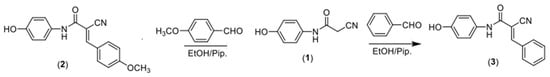 Benzaldehyde (0.21 g, 2 mmol) and acetamide 1 (0.35 g, 2 mmol) were dissolved in ethanol, and the reaction mixture was refluxed for 1 hour in the presence of catalytic piperidine. After filtration, EtOH was added for washing, and the solid product was crystallized by ethanol and DMF mixture (5:1) (Figure 1).