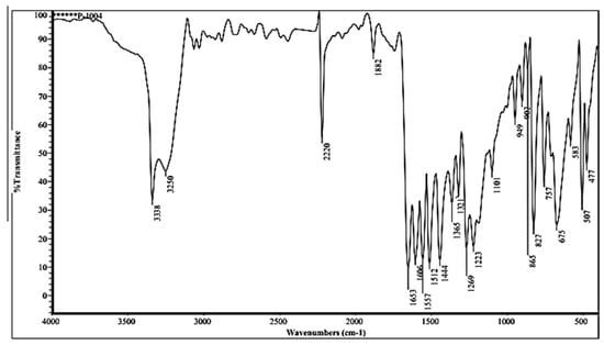 The IR of the compound (ACR-3) showed absorption bands at 3401, 3338, 2220, and 1653 cm−1, corresponding to hydroxyl, amino, cyano, and carbonyl groups, respectively as in Figure 5.