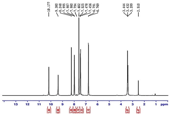 The 1H NMR showed a singlet signal at TM 3.87 ppm, corresponding to the methoxy group, in addition to multiplet signals at TM 6.75–8.02 ppm for aromatic protons. Moreover, singlet signals were found at TM 8.16, 9.34, and 10.03 ppm for the methine, OH, and NH protons, respectively as in Figure 3.
