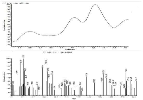 MS m/z (%): 264 (M+, 40.25), 259 (36.22), 245 (62.84), 205 (58.23), 174 (51.07), 113 (56.05), 95 (74.61), 61 (100.00), and 56 (87.29). The MS exhibited a molecular ion peak at m/z = 264 (M+, 40.25%), congruous to a molecular formula C16H12N2O2 as in Figure 7.
