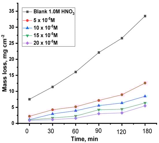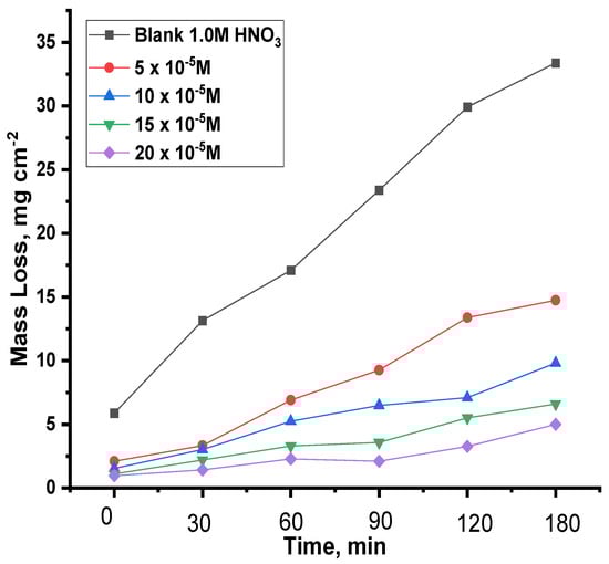 Cu mass loss under various concentrations of ACR-2 in 1.0 M HNO3 with and without immersion times.