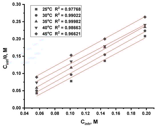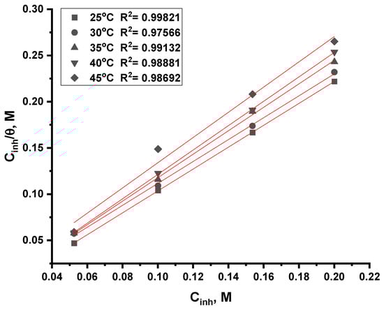 Langmuir adsorption plot as C/θ vs. C, M of ACR-2 for corrosion of copper in 1.0 M HNO3 solution at all temperatures.