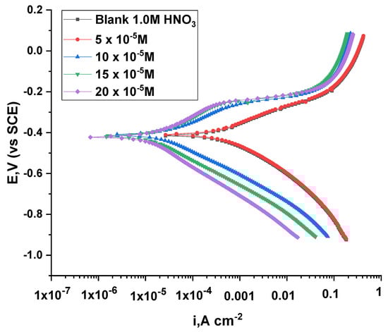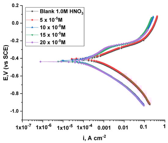 By following the cathodic and anodic curves, adding different concentrations of inhibitors will display a declining trend in the current, which indicates the tight restriction of the anodic and cathodic interactions, as shown in Figure 12 and Figure 13. In addition, the lines are parallel when the inhibitors are added with the blanks, which proves that the reaction mechanism did not change by adding the inhibitors [,]. Additionally, there was a noticeable jump in the slope of the anode curve when changing the voltage values to the positive direction, which confirms the change in the absorbance values of the inhibitor. In addition, it can be observed that the polarization curve is small, which indicates the arrival of ACR-3 and ACR-2 to the equilibrium state on the surface. Table 6 shows the coefficients of the parameters from corrosion potential (Ecorr), anodic and cathodic slope (βa, βc), icorr, and θ; through it, a significant decrease in the values of icorr can be observed with the addition of different concentrations of ACR-2 and ACR-3, the increase of which leads to a reduction in the current density to the minimum []. In addition to increasing the values of the inhibition coefficient, which confirms the ability of the compounds ACR-2 and ACR-3 to provide a highly efficient inhibitory performance for copper in nitric acid owing to the adsorption of a layer of the inhibitor on the metal’s surface. Additionally, a small change in the values of Ecorr, which proves the mixed character of these compounds [,]. Inferia et al. report that the inhibitors are either cathodic or anodic types depending on the Ecorr value shift, whereas if Ecorr value shifts below 85 mV, the inhibitor is considered a mixed type. This study reveals that the studied inhibitor is a mixed-type inhibitor, as measured by a maximum displacement in Ecorr of 85 mV [].