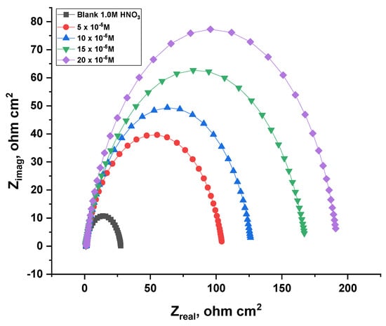 The results of AC impedance were extracted, which are presented in Figure 14 and Figure 15 for the ACR-2 and ACR-3 compounds at 25 °C. As a result of the addition of these compounds, the rate of charge transfer was delayed, which is represented in the first incomplete circle, while the other half circle appears as a consequence of the heterogeneity of the copper surface []. Accordingly, the diameter of the halves of the circles gradually increases with raised doses of inhibitors owing to the dissolution of nitrate ions caused by ACR-2 and ACR-3. Calculating the capacitance of the double layers as follows []: