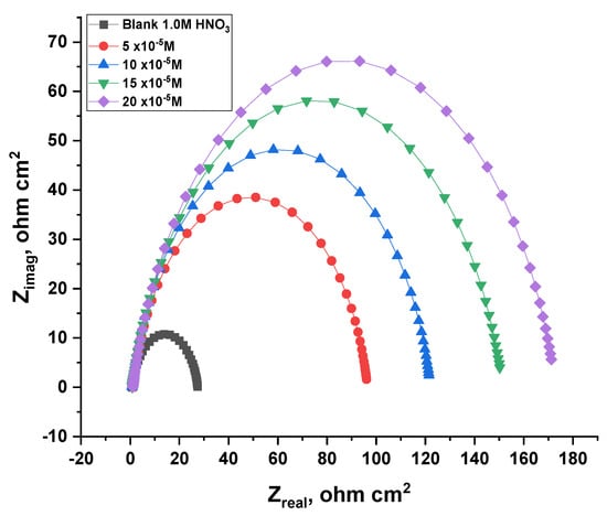 where Y0 and fmax are the magnitude of the CPE and frequency at which the imaginary component of the impedance reaches the maximum value, respectively. n is an adjustable factor, n = α/(π/2), and α is the phase angle. As the concentrations of the compounds increase, the values of Cdl decrease because the thickness of the adsorbed layer on the copper surface increases []. Based on the impedance data in Table 7 and Table 8, it can be concluded that inhibitor doses and hence inhibitory efficacy in acidic solutions increase with increasing Rct values. The creation of a protective coating at the metal solution contact can be attributed to this. There was only one charge transfer mechanism during copper dissolution, determined by the appearance of a semicircle without any impact on the molecule being studied. A decrease in double-layer capacitance was observed with increasing inhibitor doses []. This can be attributed to the density of the electrical double layer.